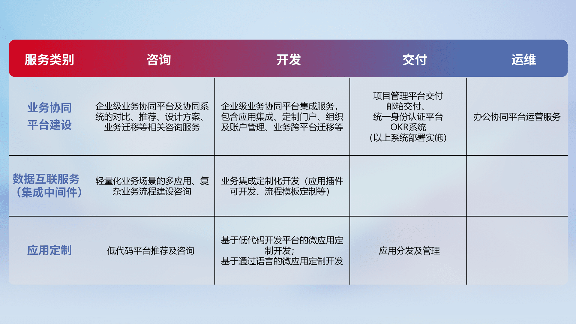 针对钉钉、、、企微、、、、IDaas等平台级产品提供产品的规划、、方案、、交付、、、、定制化开发等服务,,实现如统一协同办公、、、智能客户服务、、混合会议管理、、、、智能数据查询、、、、等业务场景,,实现数字化转型。。。。